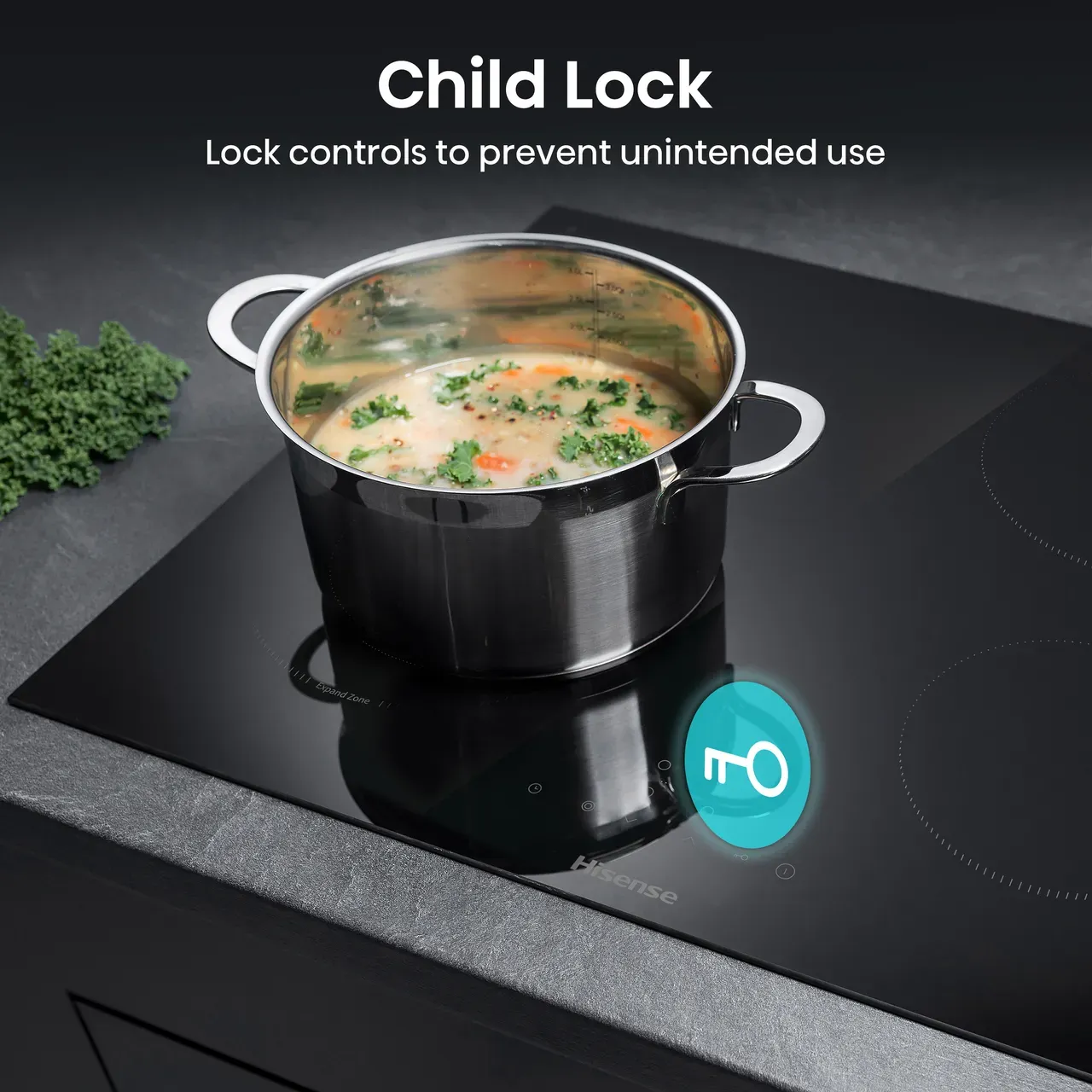 The Hisense ceramic hob includes essential safety systems.